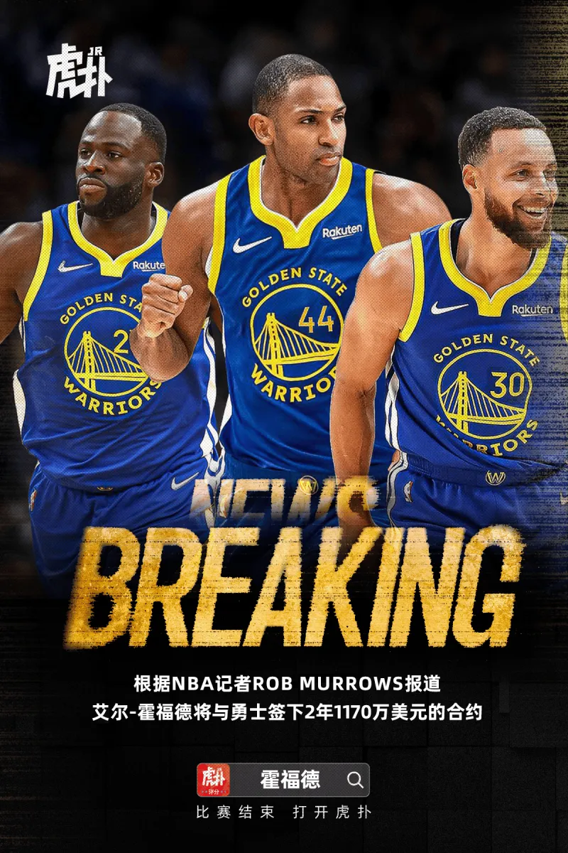 虎扑09月05日讯 根据NBA记者Rob Murrows报道,消息源透露,自由球员艾尔-霍福德将与勇士签下2年1170万美元合约,第二年球员选项。