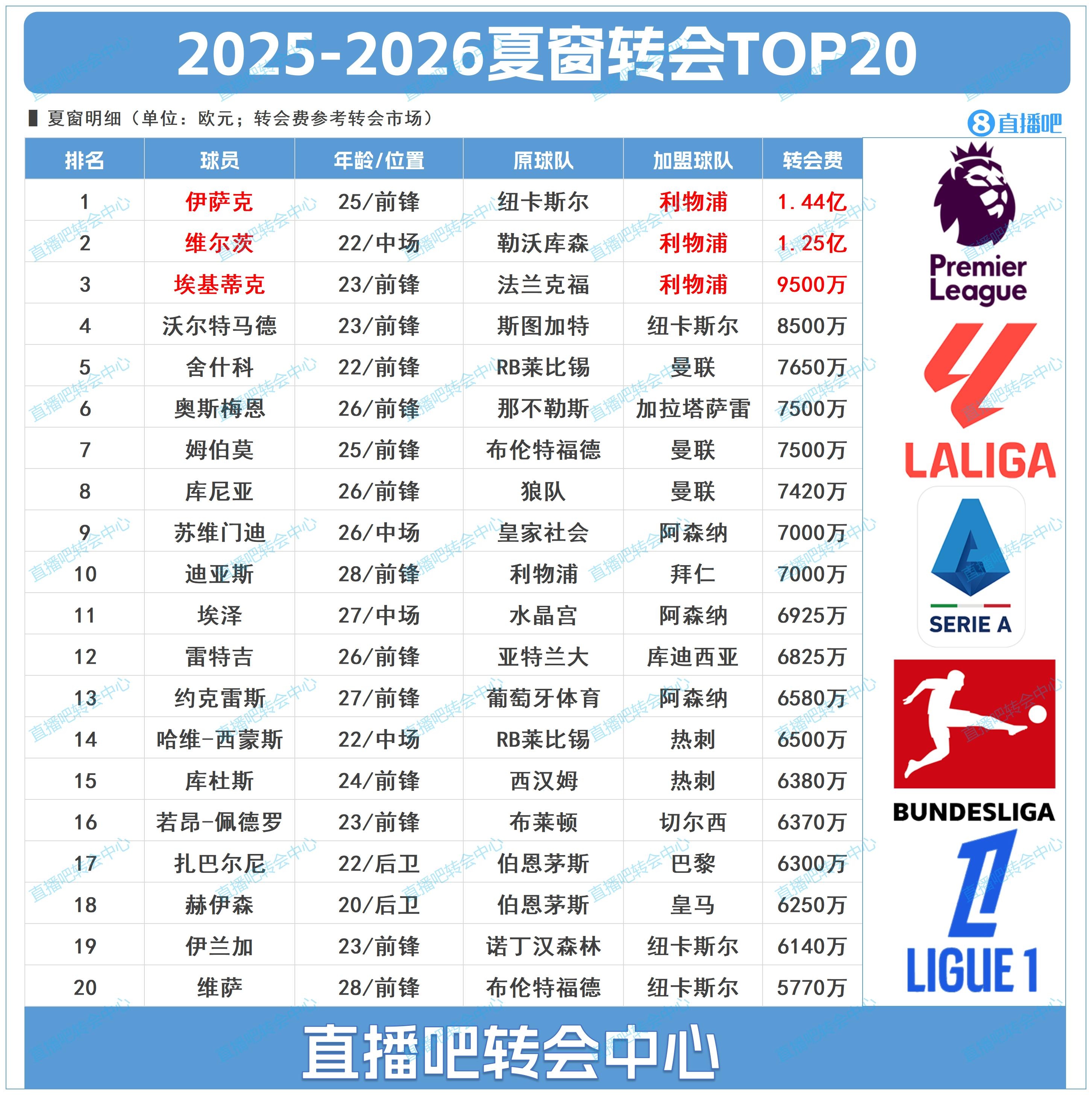 kaiyun客户端-夏窗TOP20转会:伊萨克1.44亿欧标王!利物浦包揽前三&两刷纪录