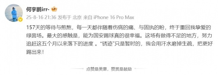 8月16日讯 中超联赛第21轮,北京国安客场3-1击败青岛西海岸。赛后,伤愈复出的何宇鹏发文谈到了自己的感受。