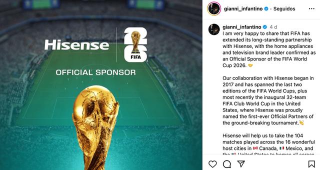 官宣当日,国际足联主席因凡蒂诺在社交媒体上罕见点名发声,高度评价双方的合作关系:「我荣幸宣布,国际足联与长期战略合作伙伴海信集团正式完成续约。作为全球领先的家电与消费电子品牌,海信已确认成为 2026 年世界杯™全球官方赞助商。」