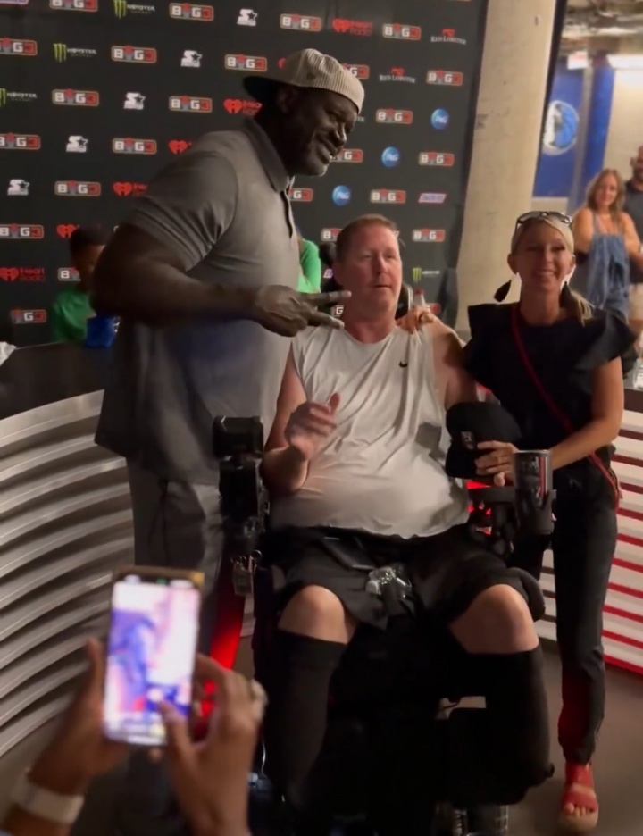 08月18日讯 前NBA球员、53 岁的“大竹竿”肖恩-布拉德利坐轮椅观战Big3联赛,一双小腿已经截肢。