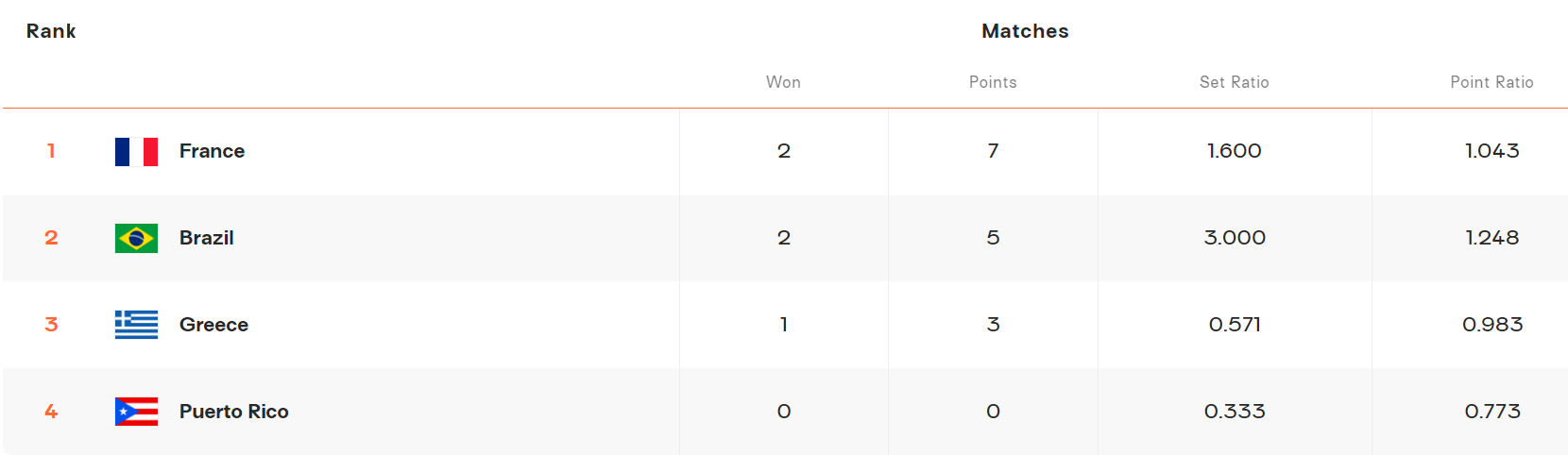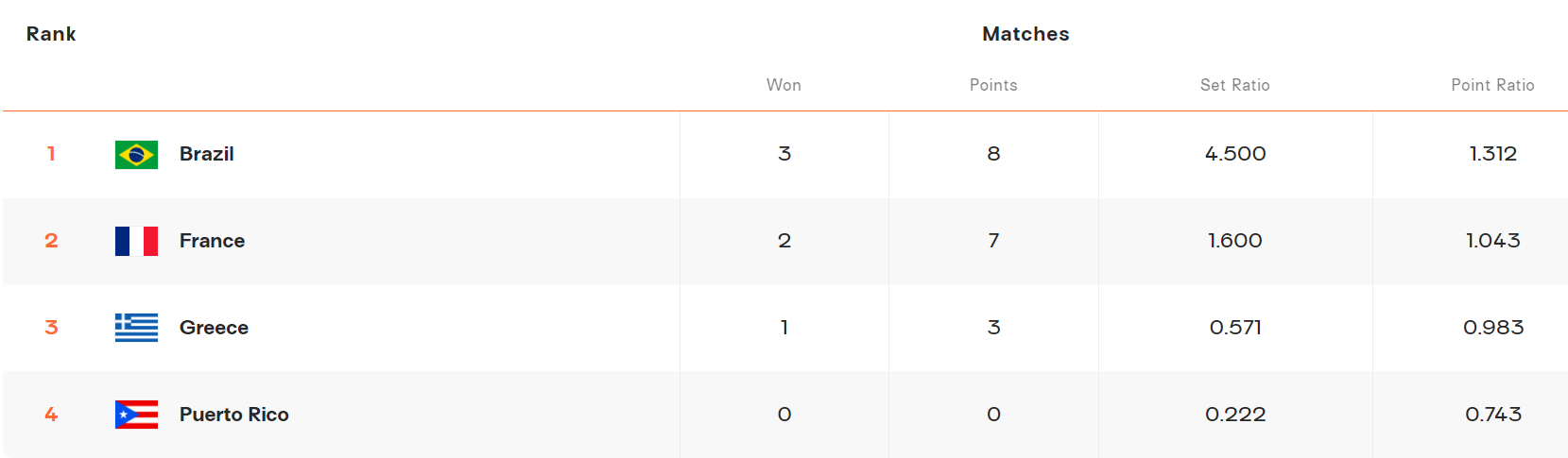 这是巴西队击败波多黎各队之后的最新积分榜,巴西队积8分锁定小组第一,法国队积7分锁定小组第二。